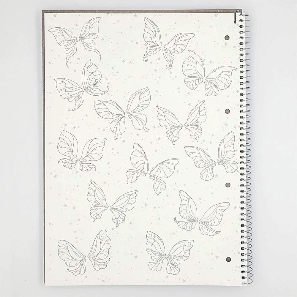 Обложка состоит из плотного картона, который защищает бумагу от внешних факторов. Яркий принт обложки имеет тиснение на голографической фольге, на внутренней стороне раскраска в тематике тетради.