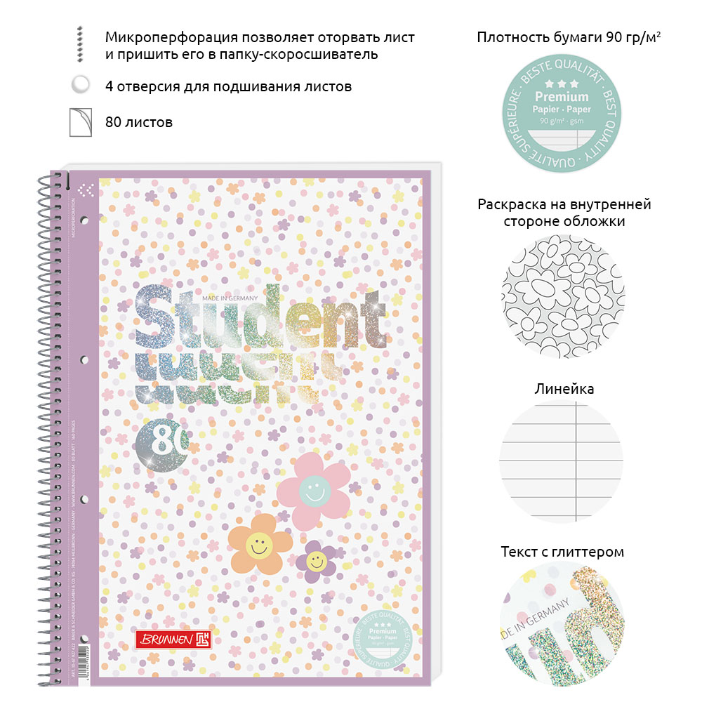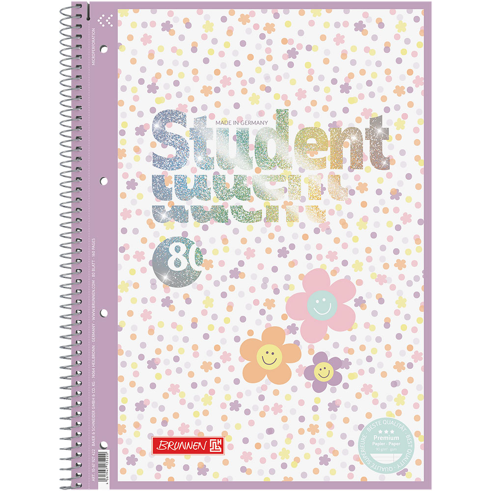 Тетрадь в линейку на пружине А4 Brunnen Premium Happy Hippie, микроперфорация, 90 гр/м2, 80 листов В линейку