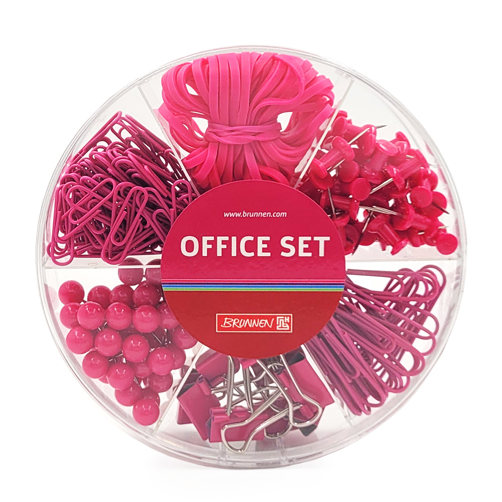 Незаменимый помощник любого офисного сотрудника. Сет из: 25 больших скрепок, 80 маленьких, 50 круглых кнопок, 40 фигурных кнопок, 10 зажимов и 40 резинок. Цвет: розовый.