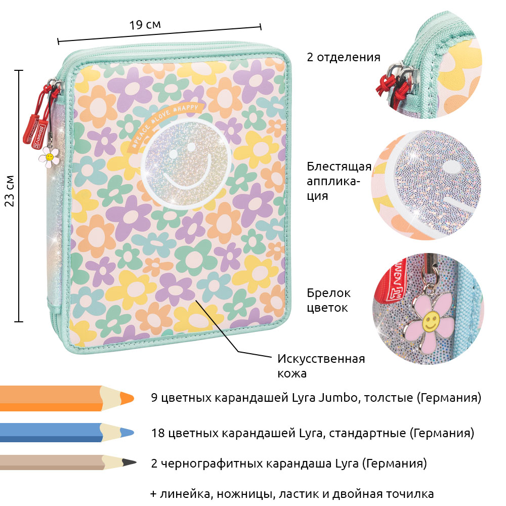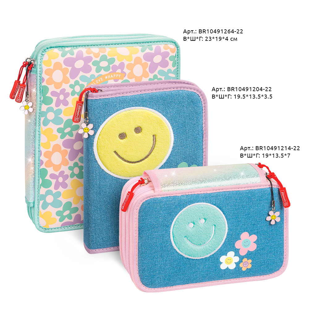 Пенал для пишущих принадлежностей Brunnen Happy Hippie XXL, с наполнением, 23 x 19 x 4 см Смайлики цветы