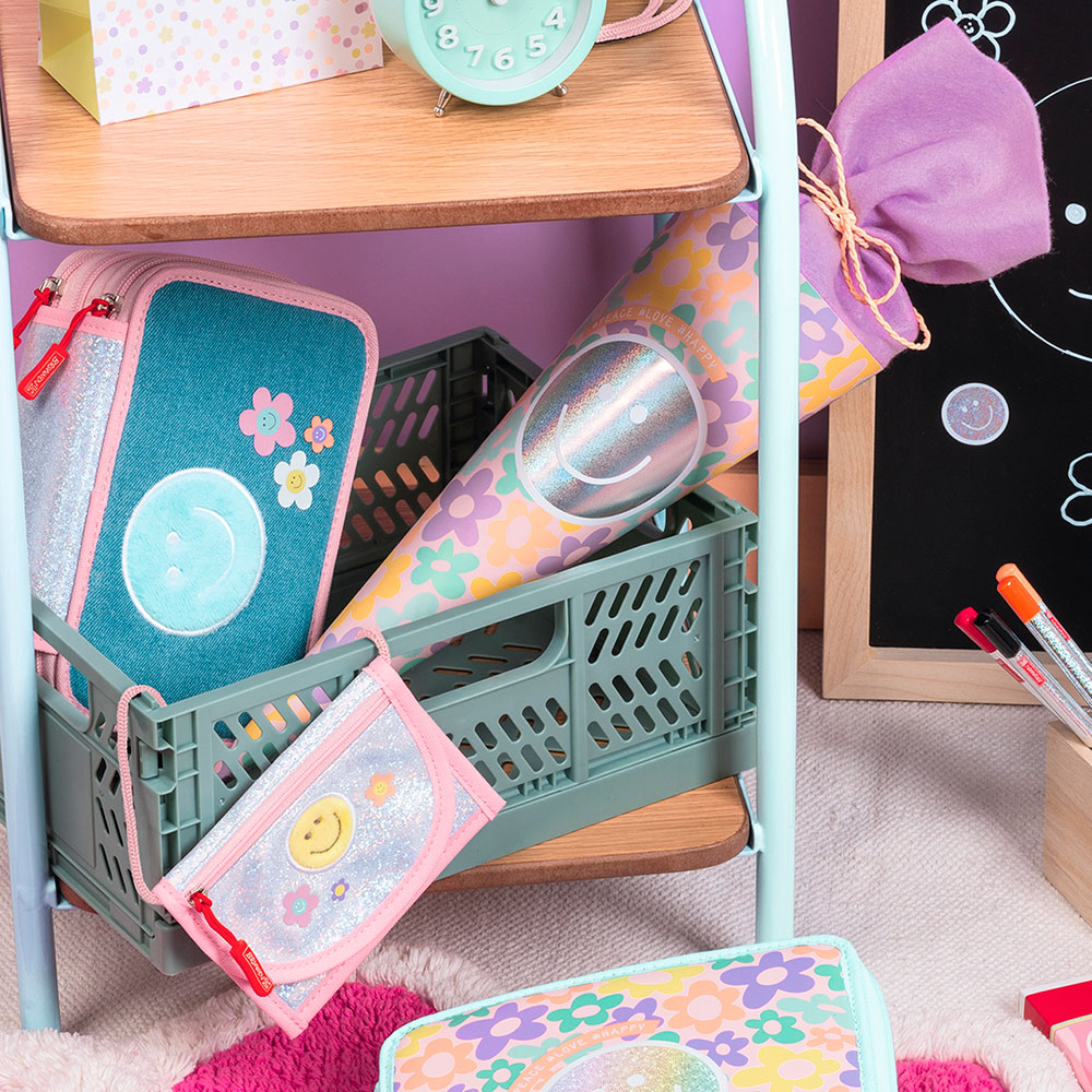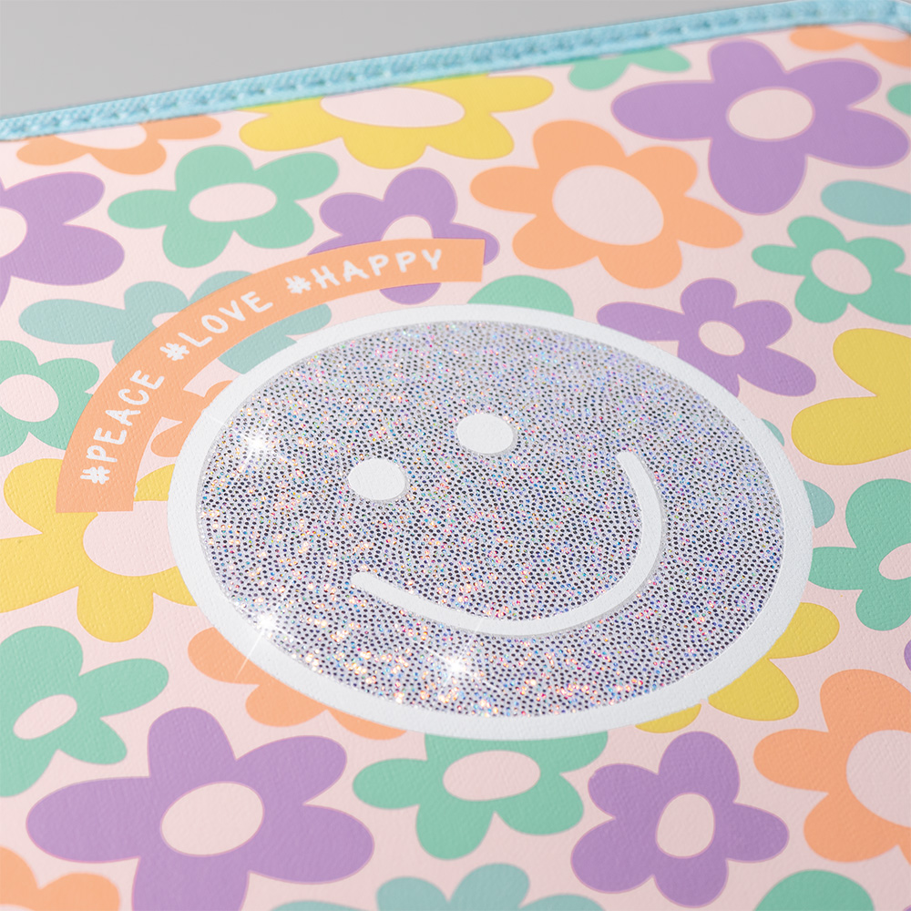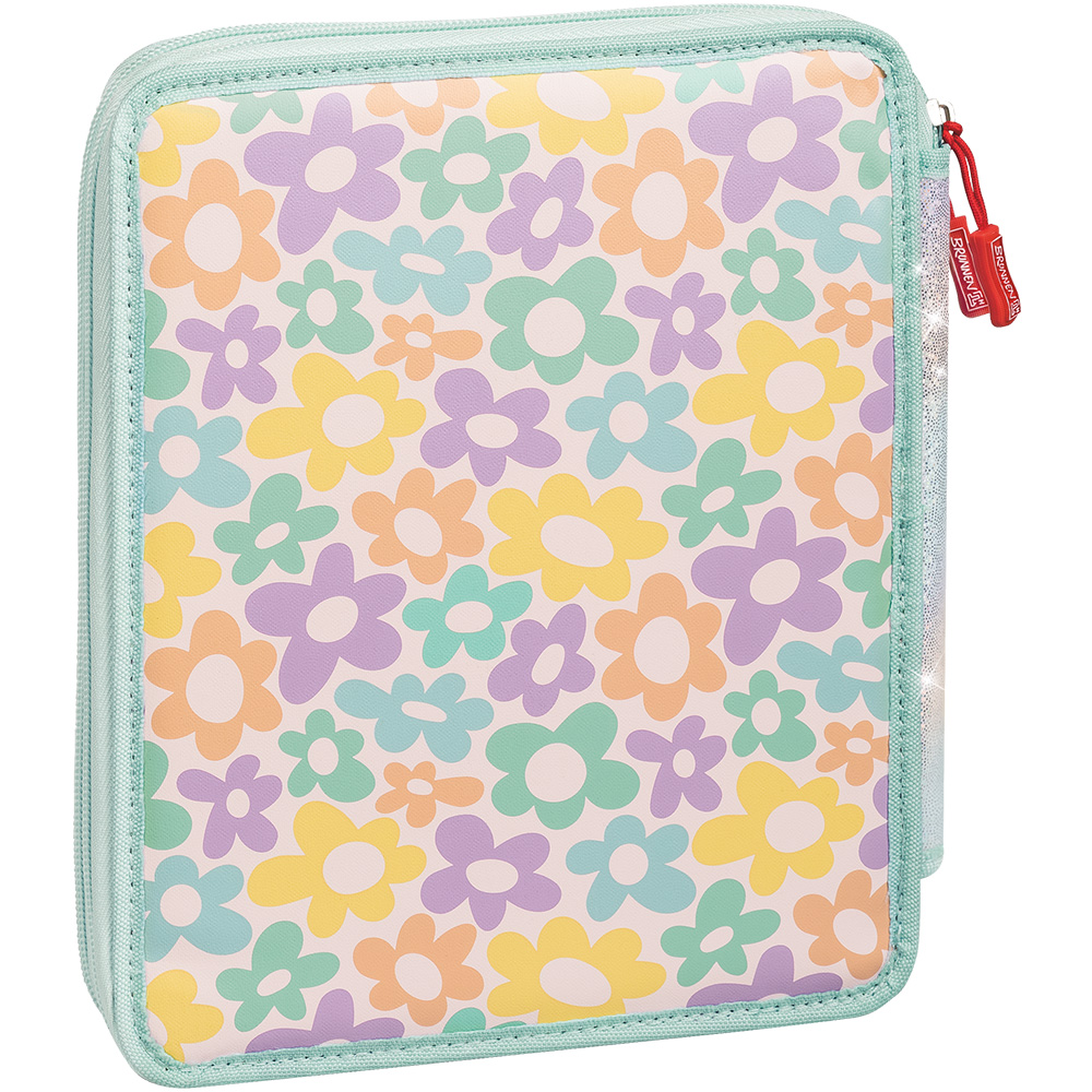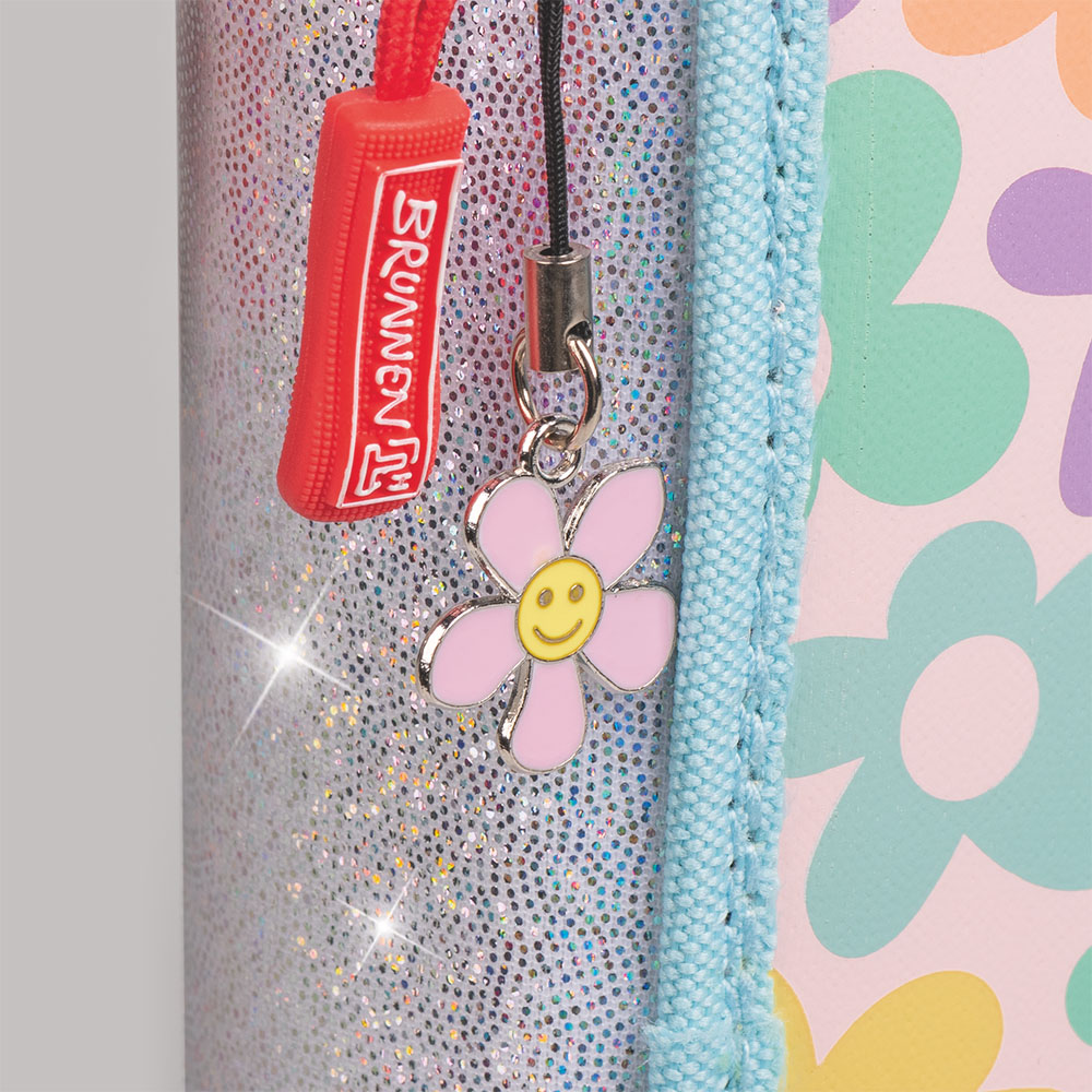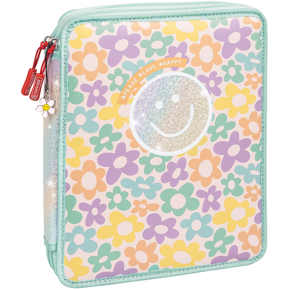 Большой пенал с 2 молниями Brunnen в дизайне “Happy Hippie”. С принтом из пастельных цветочков и блестящей аппликацией смайлик. На торце пенала блестящая вставка. Красивый брелок-подвеска в виде цветка с улыбкой.